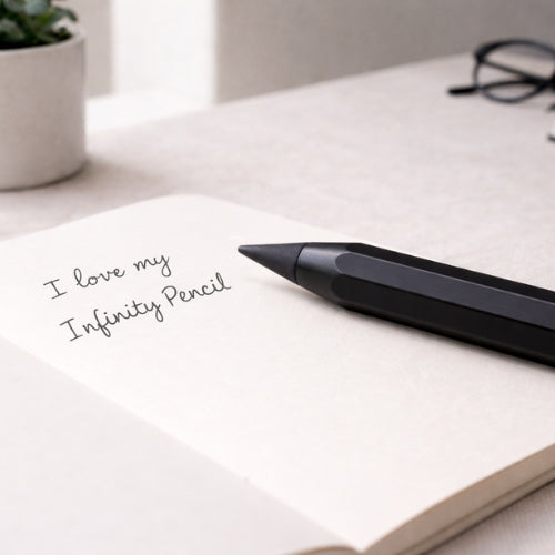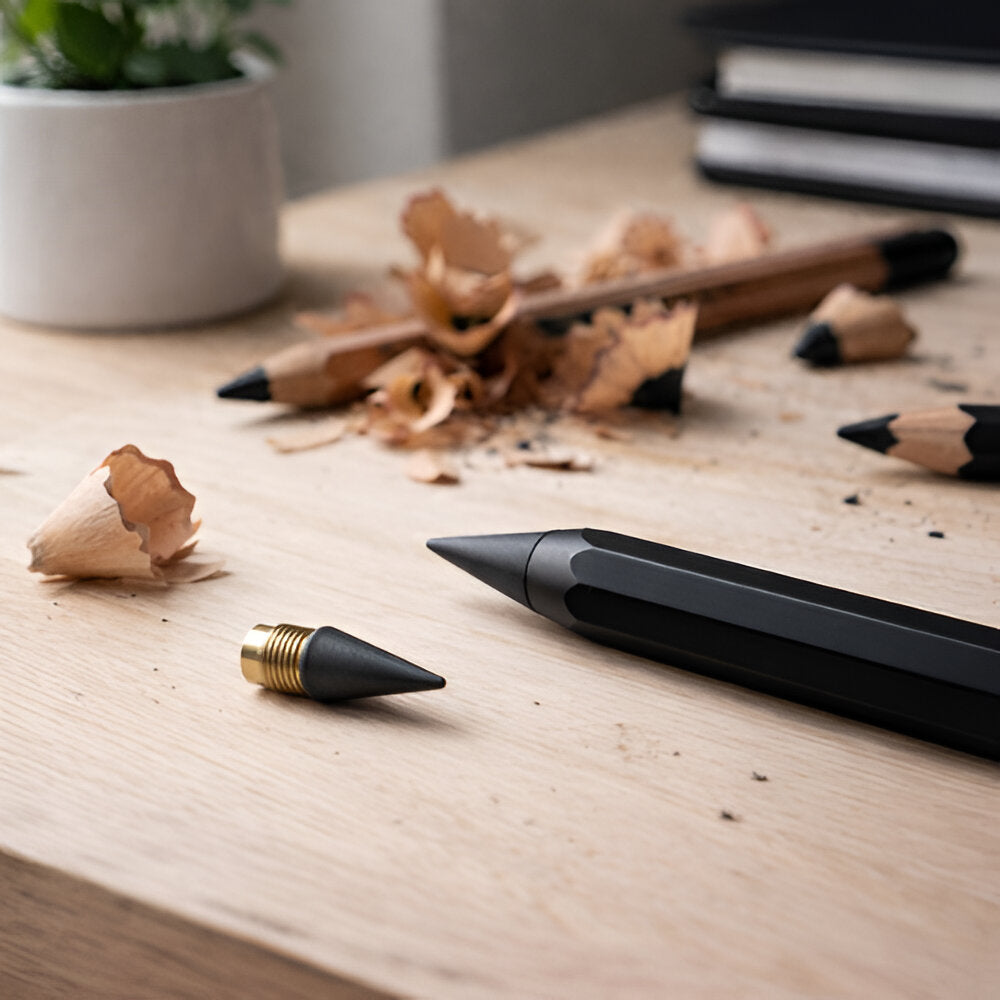Der Infinity Pencil geht einen anderen Weg. Er schreibt, ohne dass er angespitzt werden muss und ist darauf ausgelegt, dich über Jahre hinweg zu begleiten.
